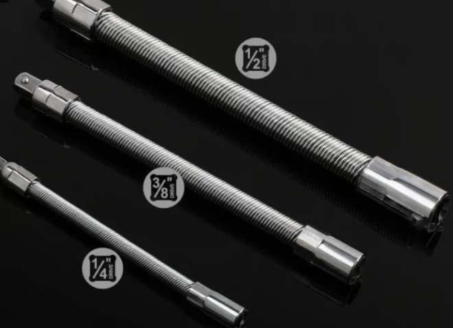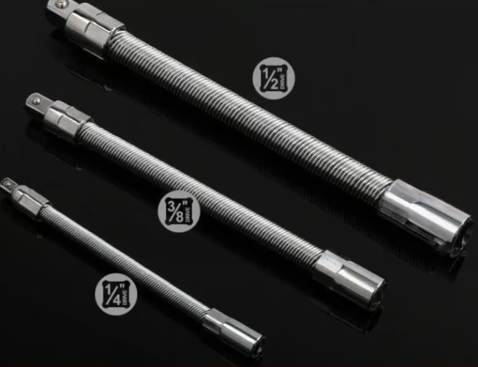 INCLUDES: This flexible socket extension set includes one 1/2-inch drive(10-inch length),one1/4-inch drive (6-inch length) and one 3/8-inch drive (8-inch length) extension. Easy to solve the problem of narrow corner that conventional tools can't reach in auto repair work.
