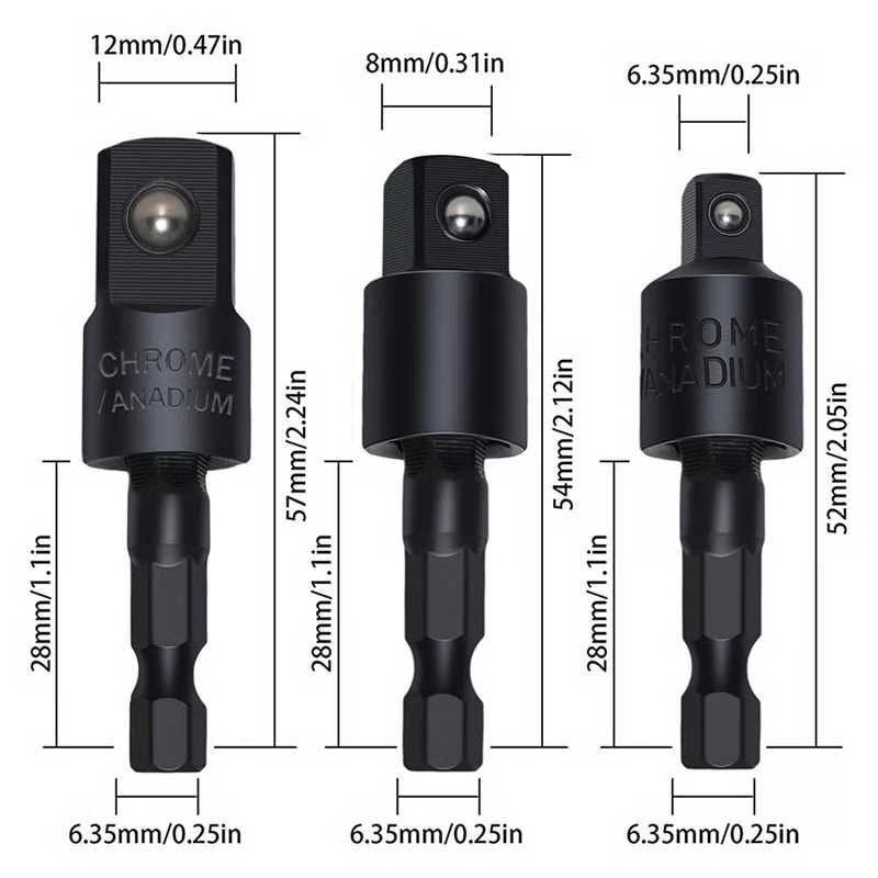 Includes 3 rotatable hex shank adapters (1/4", 3/8", 1/2") for use with impact drivers, drills, and screwdrivers—perfect for socket conversion and versatile applications. 🔄