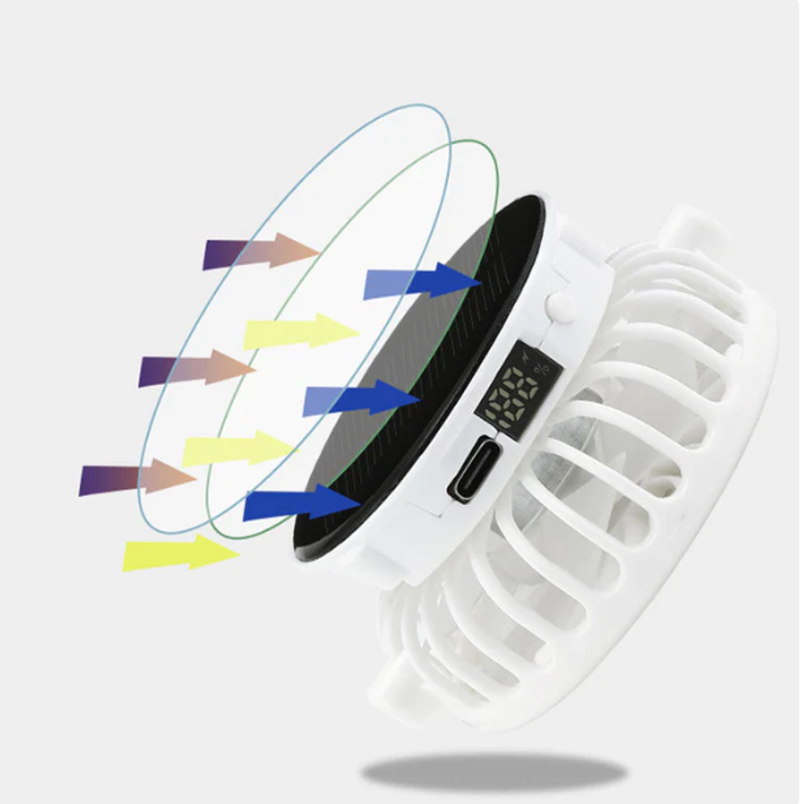 DUAL POWER OPTIONS: Enjoy continuous cooling with flexible charging solutions. The high-efficiency monocrystalline solar panel (5V/80mA) powers the fan automatically in direct sunlight - simply wear it outdoors to activate. When indoors or in low-light conditions, the built-in 1200mAh battery provides reliable backup power. Easily switch between power sources with a long press of the control button.