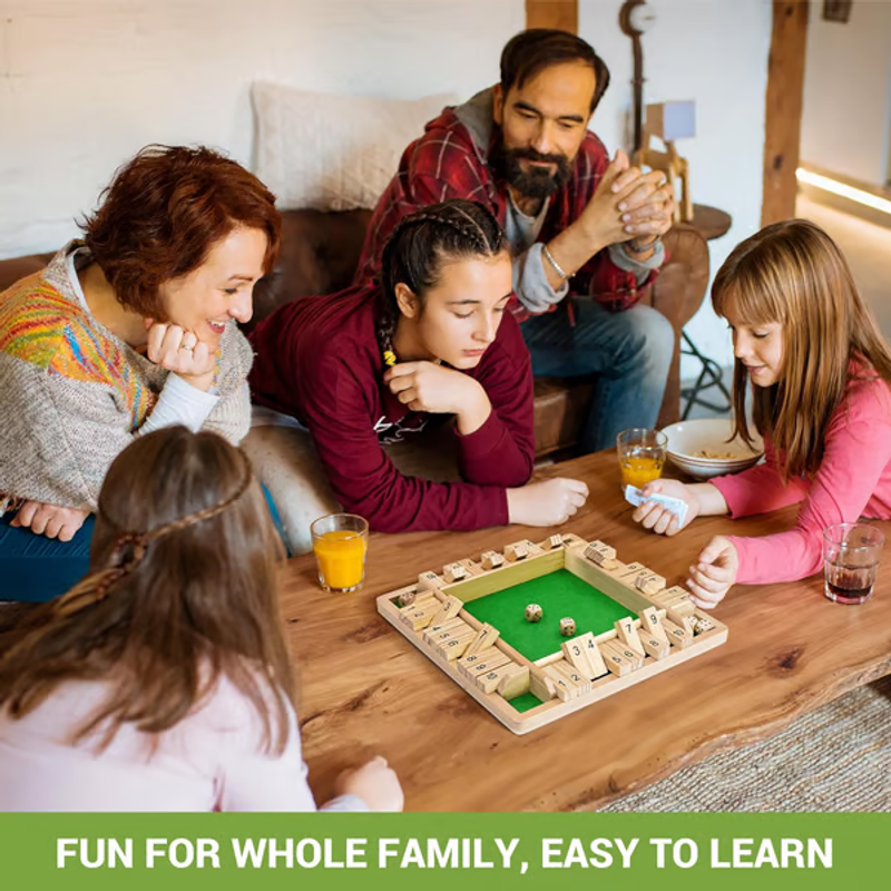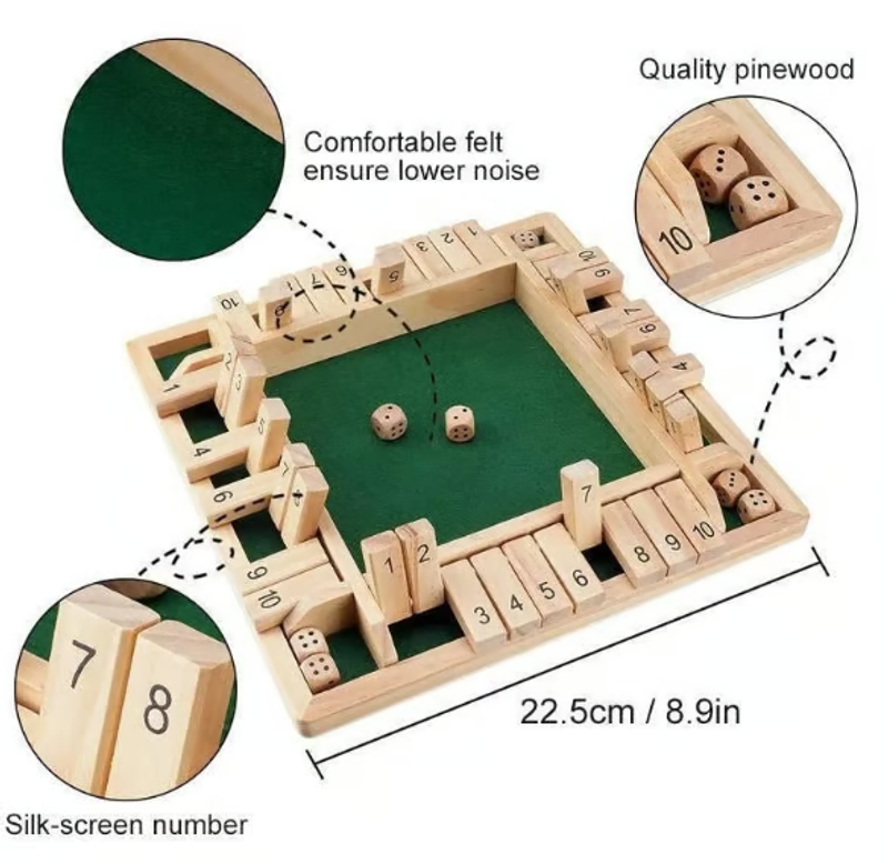 Shut the box made of solid pinewood. The design of felt surface reduces noise when the board game is going on. Durable, scratch-resistant and environmentally friendly.Four different colors of acrylic silk-screen technology dice to ensure long-term use.