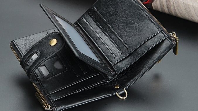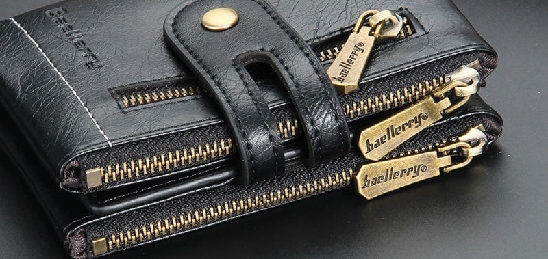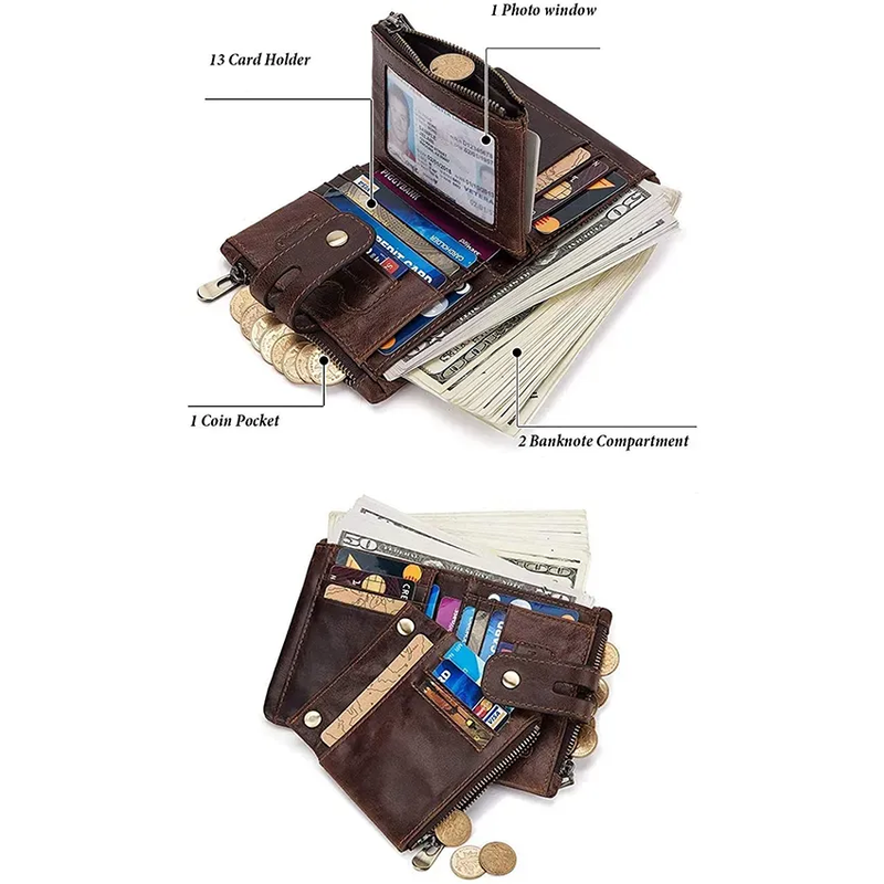 • 13 Card Slots (Magnetic & regular) • 2 Zippered Coin Pockets • 2 Banknote Compartments • 1 Photo Window • 1 Driver's License Slot • 2 SD Card Holders • 1 Receipt/Invoice Pocket
